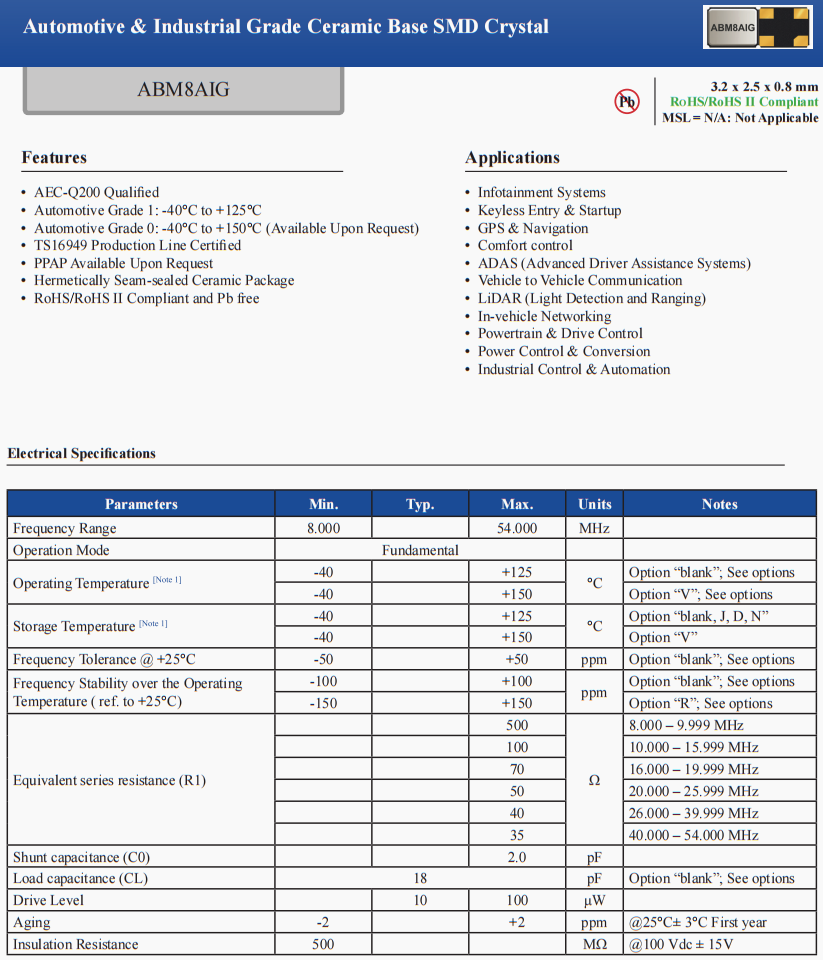 ABM8AIG-12.288MHZ-12-2-T3進口晶振,Abracon進口3225晶振,ABM8AIG汽車動力總成晶振,美國Abracon晶振公司,艾博康晶振,ABM8AIG晶振,ABM8AIG-12.288MHZ-12-2-T3晶振,進口晶振,無源晶振,美國晶振,高品質晶振,低損耗晶振,高精度晶振,3225晶振,四腳晶振,石英晶體,貼片晶振。AEC-Q200合格,汽車等級1:-40°C至+125°C,汽車等級0:-40°C至+150°C(可根據要求提供),TS16949生產線認證,PPAP可根據要求提供,密封密封陶瓷封裝,符合RoHS/RoHS II標準且不含鉛,信息娛樂系統,無鑰匙進入和啟動,GPS和導航,舒適控制,ADAS(高級駕駛輔助系統),車對車通信,激光雷達(光探測和測距),車載網絡,動力總成和驅動控制,電源控制和轉換,工業控制和自動化