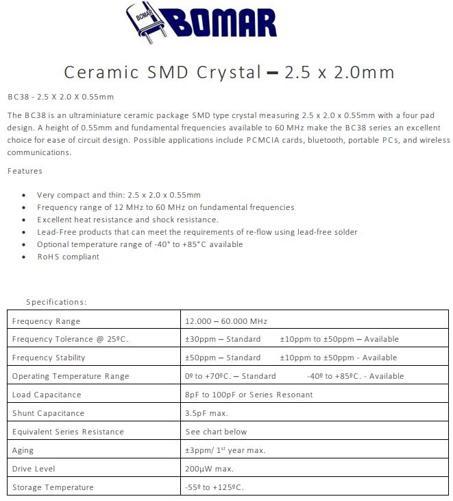 Bomar晶振,BC38晶振,BC38EFA120-10.000000晶振,小型貼片石英晶振,外觀尺寸具有薄型表面貼片型石英晶體振蕩器,特別適用于有小型化要求的市場(chǎng)領(lǐng)域,比如智能手機(jī),無(wú)線藍(lán)牙,平板電腦等電子數(shù)碼產(chǎn)品.晶振本身超小型,薄型,重量輕,晶體具有優(yōu)良的耐環(huán)境特性,如耐熱性,耐沖擊性,在辦公自動(dòng)化,家電相關(guān)電器領(lǐng)域及Bluetooth,WirelessLAN等短距離無(wú)線通信領(lǐng)域可發(fā)揮優(yōu)良的電氣特性,滿足無(wú)鉛焊接的回流溫度曲線要求.Bomar 成立于 1963 年,是一家為商業(yè)和雙向無(wú)線電行業(yè)生產(chǎn)石英晶體的制造商。該業(yè)務(wù)的性質(zhì)要求在寬頻率范圍內(nèi)具有嚴(yán)格的容差和高穩(wěn)定性晶體,以滿足嚴(yán)格的 FCC 規(guī)范。快速生產(chǎn)的需求對(duì)我們不斷增長(zhǎng)的客戶群很重要。我們的許多客戶都是當(dāng)?shù)亍⒅莺吐?lián)邦警察和監(jiān)視機(jī)構(gòu)。Bomar 很快不僅成為該市場(chǎng)的領(lǐng)先供應(yīng)商,而且因其產(chǎn)品質(zhì)量、快速周轉(zhuǎn)時(shí)間和無(wú)與倫比的客戶服務(wù)而獲得一致認(rèn)可。