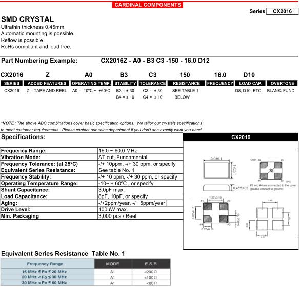 | Cardinal晶振規格 | 單位 | CX2016晶振頻率范圍 | 石英晶振基本條件 |