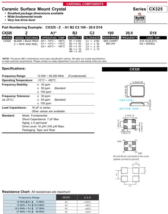 Cardinal晶振,CX325晶振,CX325-Z-A1B2C2100-20.0D18晶振