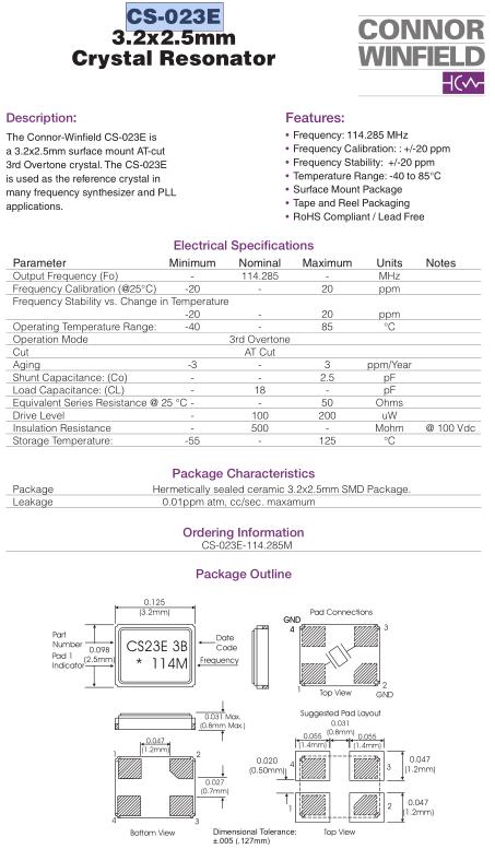 康納溫菲爾德晶振,CS-023E晶振,CS-023E-114.285M晶振,超小型表面貼片型SMD晶振,最適合使用在汽車電子領域中,也是特別要求高可靠性的引擎控制用CPU的時鐘部分.低頻晶振可從7.98MHz起對應,小型,超薄型具備強防焊裂性,石英晶體在極端嚴酷的環境條件下也能發揮穩定的起振特性,產品本身具有耐熱,耐振,耐撞擊等優良的耐環境特性,滿足無鉛焊接以及高溫回流溫度曲線要求,符合AEC-Q200標準.