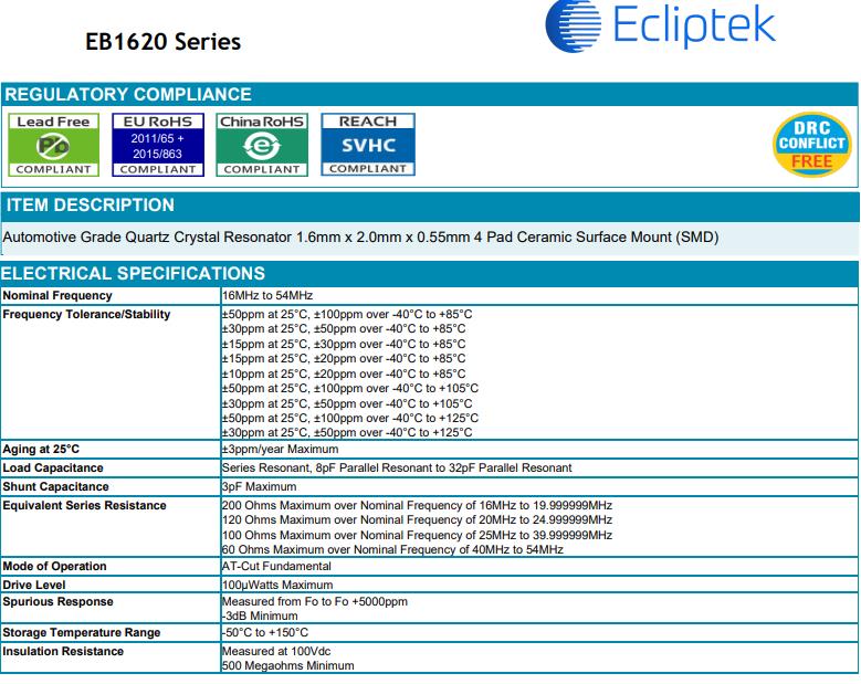 請勿在PH值范圍可能導致腐蝕或溶解石英晶振或包裝材料的環境下使用或儲藏這些產品.Ecliptek晶振EB1620,EB1620JA10-20.000M-TR無源晶體