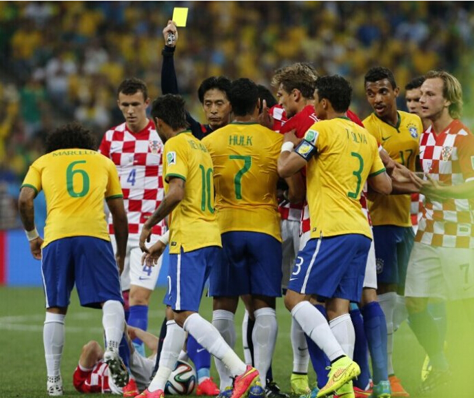 下半場,克羅地亞防守隊(duì)員在禁區(qū)內(nèi)拉到了巴西隊(duì)員弗雷德,裁判的直接判罰點(diǎn)球讓本來就對裁判此前的判罰有頗多意見的克羅地亞人更加憤怒,直接把裁判圍了起來。可是再怎么爭論也沒用,又是內(nèi)馬爾,主罰點(diǎn)球一蹴而就。雖然克羅地亞門將撲到了皮球,但皮球還是速度太快,飛進(jìn)了網(wǎng)窩。