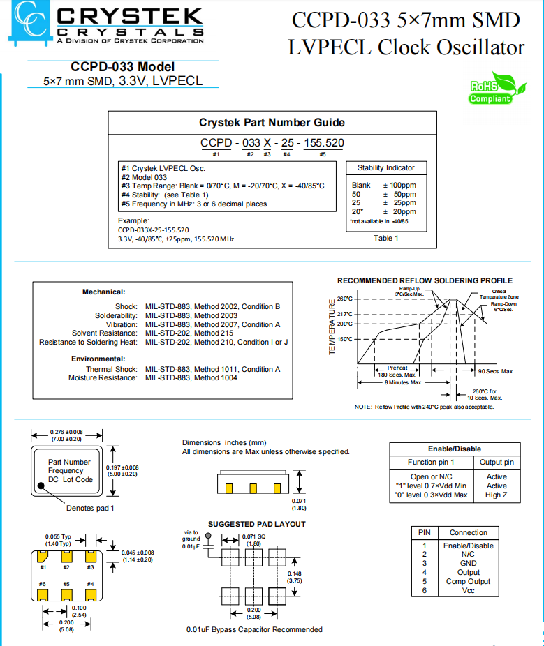 美國CRYSTEK瑞斯克晶振型號CCPD-033,是一個小體積晶振尺寸7.0x5.0mm SMD,六腳貼片晶振,石英晶體振蕩器,LVPECL時鐘晶體振蕩器,頻率范圍:77.760MHz到161.132800MHz,工作電壓3.3V。該振蕩器采用了高Q第三泛音晶體設計,該有源晶振提供了非常低的抖動和相位噪聲,低功耗,低耗能等特點,輸出信號中沒有子諧波。應用范圍:數字視頻,聲波儀SDH/DWDM,存儲區域網絡,寬帶接入,以太網、千兆以太網等應用。LVPECL時鐘振蕩器CCPD-033M-50-156.250用于數字視頻信號