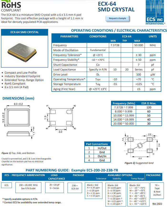 | ECS-120-CD-0330-TR | ECS Crystal | ECX-64 | 12MHz | -20°C ~ 70°C | 4-SMD, No Lead |
