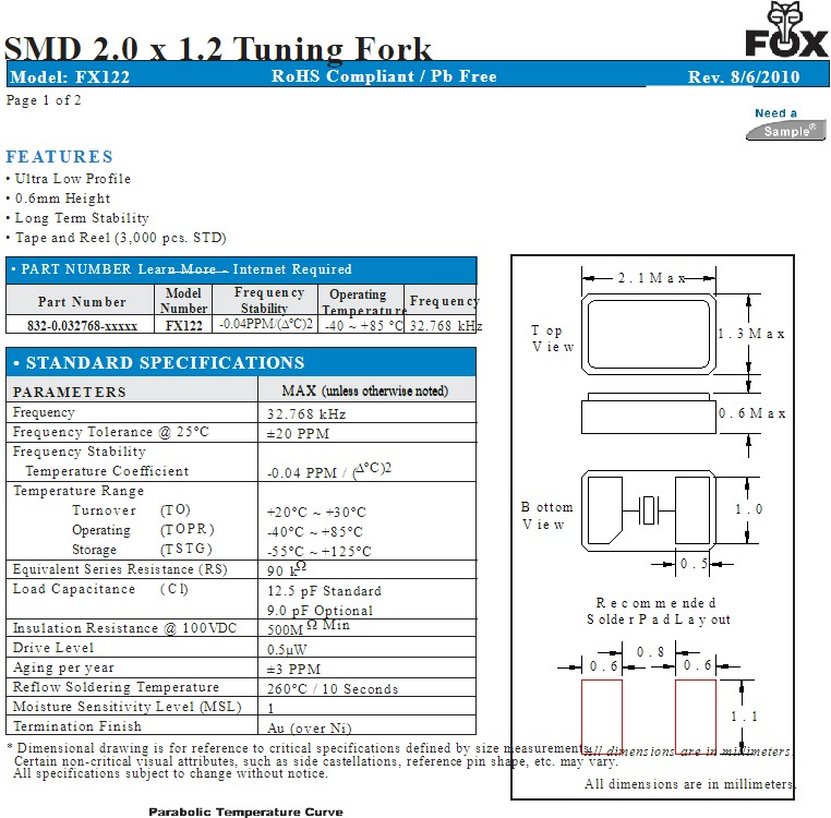 | FX122-327 | Fox Electronics | FX122 | kHz Crystal (Tuning Fork) | 32.768kHz |