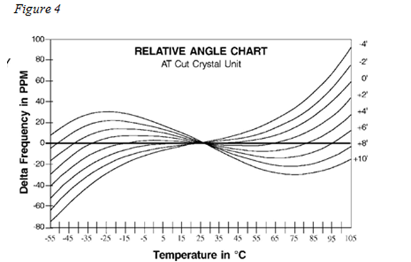 在各種元件中,石英晶振“AT”切割變得最受歡迎,因為它在相對較高的頻率下可用,表現出出色的頻率與溫度穩定性,并且以合理的成本廣泛可用.“AT”切割晶體單元的頻率與溫度能力如圖4所示.