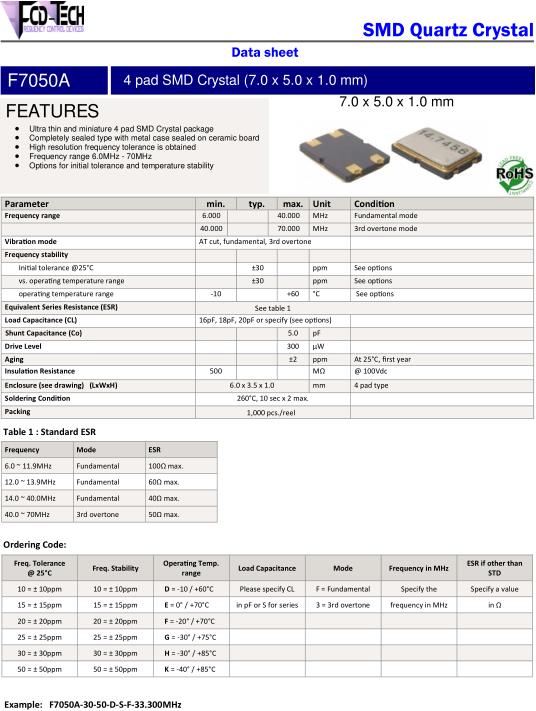 用于JEDEC J-STD-020D.01回流條件的耐熱可用性需個別判斷。請聯系我們以便獲取相關信息。FCD-Tech晶振,F7050A晶振,F7050A-3050DSF-26.000MHz晶振.