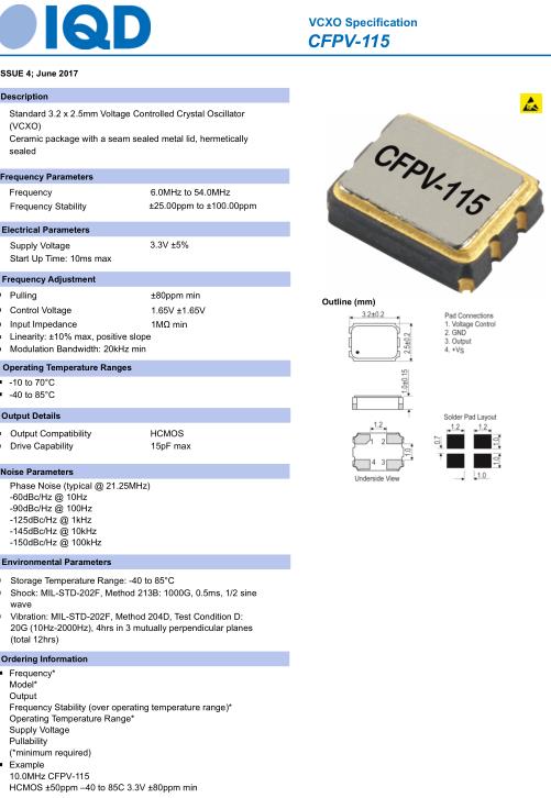 IQD晶振,CFPV-115晶振,10.0MHz-CFPV-115晶振,壓控晶振(VCXO),壓控石英晶體振蕩器基本解決方案,PECL輸出,輸出頻率60MHz到200MHz之間,出色的低相位噪聲和抖動(dòng),三態(tài)功能,應(yīng)用:SDH/SONET,以太網(wǎng),基站,筆記本晶振應(yīng)用,符合RoHS/無(wú)鉛.IQD伊克德晶振集團(tuán)有超過(guò)40年的生產(chǎn)頻率元件產(chǎn)品經(jīng)驗(yàn),在頻率控制市場(chǎng)上,IQD是公認(rèn)的市場(chǎng)領(lǐng)導(dǎo)者.擁有60多個(gè)國(guó)家的活躍客戶(hù),伊克德提供了最全面的晶振晶體頻率范圍,從低成本的商業(yè)級(jí)產(chǎn)品到高可靠性工業(yè)、汽車(chē)和軍事等級(jí)的應(yīng)用,包括:晶振,石英貼片晶振,水晶振蕩子,晶體振蕩器,壓控溫補(bǔ)晶振,石英晶體諧振器等.