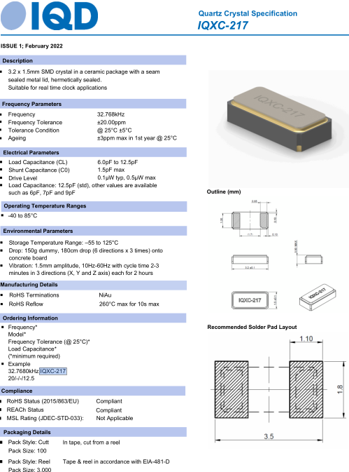IQD伊克德晶振在1988年獲得證書到BS 5750,所有IQD石英晶振,石英晶體諧振器,壓電水晶的設計、制造和測試設備都被認證為ISO 9001:2008.我們的質量管理體系不斷完善和適應各個領域的使用,以滿足國際標準和客戶的需求.伊克德晶振,IQXC-217晶振,32.7680kHz-IQXC-217-20/12.5晶振.