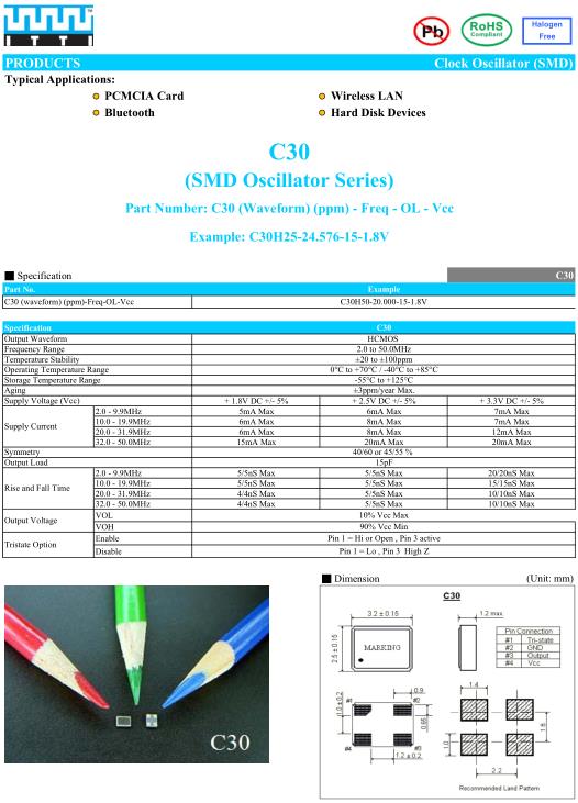 ITTI晶振,C30晶振,C30H25-24.576-15-1.8V晶振,小型SMD有源晶振,從最初超大體積到現(xiàn)在的7050mm,6035mm,5032mm,3225mm,2520mm體積,有著翻天覆地的改變,體積的變小也使產(chǎn)品帶來了更高的穩(wěn)定性能,接縫密封石英晶體振蕩器,精度高,覆蓋頻率范圍寬的特點,SMD高速自動安裝和高溫回流焊設(shè)計,Optionable待機輸出三態(tài)輸出功能,電源電壓范圍:1.8V~5V,高穩(wěn)定性,低抖動,低功耗,主要應(yīng)用領(lǐng)域:無線通訊,高端智能手機,平板筆記本W(wǎng)LAN,藍(lán)牙,數(shù)碼相機,DSL和其他IT產(chǎn)品的晶振應(yīng)用,三態(tài)功能,PC和LCDM等高端數(shù)碼領(lǐng)域,符合RoHS/無鉛.