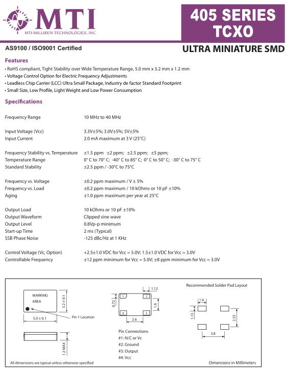 米利倫晶振,405晶振,SMD晶振,小型SMD有源晶振,從最初超大體積到現在的7050mm,6035mm,5032mm,3225mm,2520mm體積,有著翻天覆地的改變,體積的變小也使產品帶來了更高的穩定性能,接縫密封石英晶體振蕩器,精度高,覆蓋頻率范圍寬的特點,SMD高速自動安裝和高溫回流焊設計,Optionable待機輸出三態輸出功能,電源電壓范圍:1.8V~5V,高穩定性,低抖動,低功耗,主要應用領域:無線通訊,高端智能手機,平板筆記本WLAN,藍牙,數碼相機,DSL和其他IT產品的晶振應用,三態功能,PC和LCDM等高端數碼領域,符合RoHS/無鉛.我們邀請您體驗“MTI差異”。聯系我們團隊的任何成員討論您的申請,并允許我們邀請您訪問位于馬薩諸塞州歷史悠久的Newburyport鎮波士頓以北約30英里的現代化制造工廠。