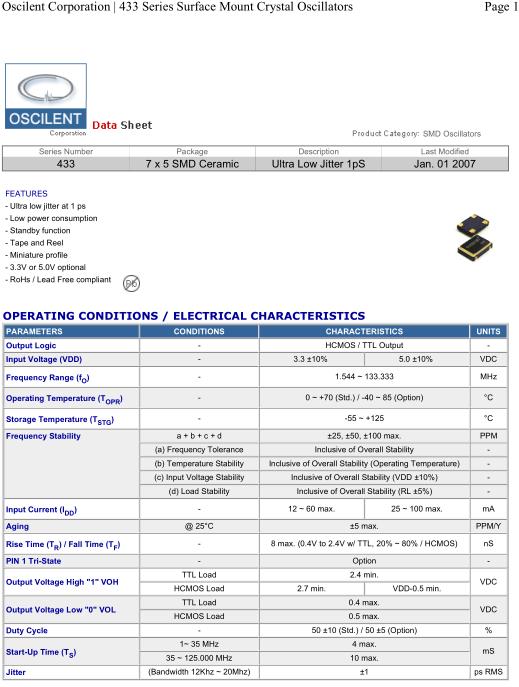 Oscilent晶振,433晶振,433-24.0M-3EN-T-TS晶振,小型SMD有源晶振,從最初超大體積到現在的7050mm,6035mm,5032mm,3225mm,2520mm體積,有著翻天覆地的改變,體積的變小也使產品帶來了更高的穩定性能,接縫密封石英晶體振蕩器,精度高,覆蓋頻率范圍寬的特點,SMD高速自動安裝和高溫回流焊設計,Optionable待機輸出三態輸出功能,電源電壓范圍:1.8V~5V,高穩定性,低抖動,低功耗,主要應用領域:無線通訊,高端智能手機,平板筆記本WLAN,藍牙,數碼相機,DSL和其他IT產品的晶振應用,三態功能,PC和LCDM等高端數碼領域,符合RoHS/無鉛.Oscilent晶振公司發展歷程: