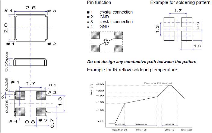 將晶振加熱包裝材料至+150°C以上會破壞產品特性或損害產品.如需在+150°C以上焊接石英晶振,建議使用SMD晶振產品.在下列回流條件下,對石英晶振產品甚至SMD貼片晶振使用更高溫度,會破壞晶振特性.建議使用下列配置情況的回流條件.安裝這些貼片晶振之前,應檢查焊接溫度和時間.同時,在安裝條件更改的情況下,請再次進行檢查.如果需要焊接的晶振產品在下列配置條件下進行焊接,請聯系我們以獲取耐熱的相關信息.