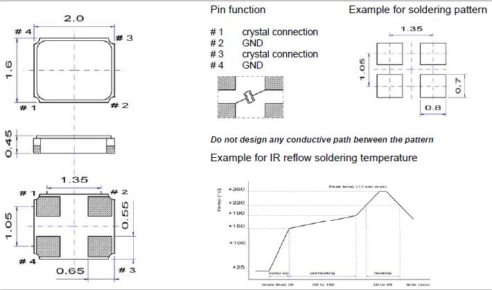 加熱包裝材料至+150°C以上會破壞產(chǎn)品特性或損害產(chǎn)品。如需在+150°C以上焊接晶體產(chǎn)品,建議使用SMD產(chǎn)品。在下列回流條件下,對晶體產(chǎn)品甚至SMD產(chǎn)品使用更高溫度,會破壞產(chǎn)品特性。建議使用下列配置情況的回流條件。安裝這些產(chǎn)品之前,應檢查焊接溫度和時間。同時,在安裝條件更改的情況下,請再次進行檢查。如果需要焊接的石英晶體產(chǎn)品在下列配置條件下進行焊接,請聯(lián)系我們以獲取耐熱的相關信息。