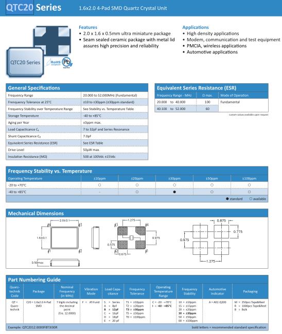 Quarztechnik晶振,QTC20晶振,QTC2012.0000FBT3I30R晶振