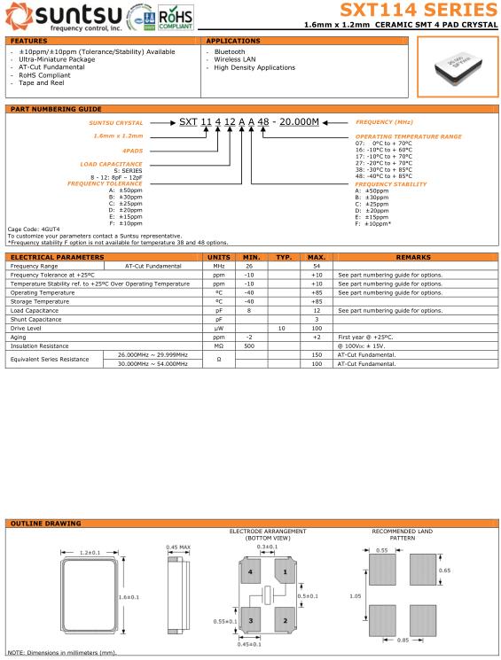 | Suntsu晶振規格 | 單位 | SXT114晶振頻率范圍 | 石英晶振基本條件 | |