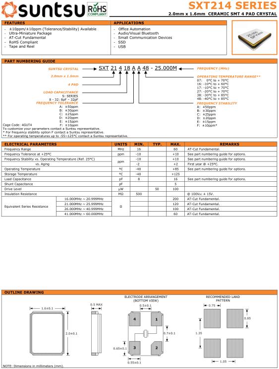 | Suntsu晶振規格 | 單位 | SXT214晶振頻率范圍 | 石英晶振基本條件 |