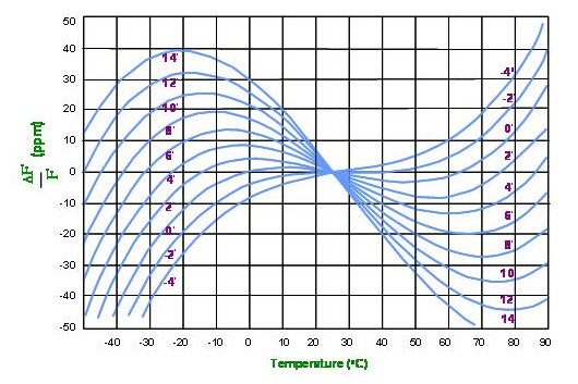 (圖二)是以AT切割角度變動在厚度振動模態的頻率對溫度特性的展開圖. 圖中以常用的室溫攝式25度作為相對零點, AT切割的最大優點是頻率對溫度變化為一元三次方曲線. 這個特性, 從(圖六)中可以看到, 在相當寬廣的溫度范圍下, AT切割的溫度曲線的第一階及第二階常數為零, 第三階的常數便決定了頻率對溫度的變化值.