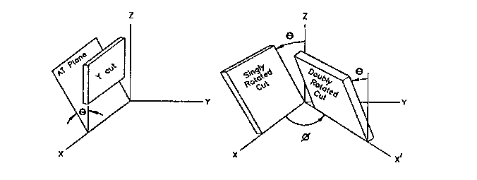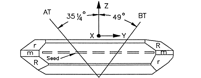 以上是用于制造at切割諧振器的由y取向種子晶體生長(zhǎng)的培養(yǎng)石英晶體的示意圖。種子晶體建立了最初的晶體取向,并以犧牲z軸為代價(jià)促進(jìn)了Y方向的生長(zhǎng)。晶種是經(jīng)過(guò)精心挑選的,以避免在晶體生長(zhǎng)過(guò)程中可能產(chǎn)生的缺陷。表明了晶種的位置。從x軸向左傾斜的線(xiàn)表示AT板的鋸切位置,向右傾斜的線(xiàn)表示bt切割。在實(shí)踐中,這些角度是非常關(guān)鍵的,并使用布拉格x射線(xiàn)衍射精確確定。