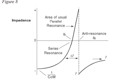 阻抗/電抗曲線如圖所示,晶體有兩個零相位的頻率